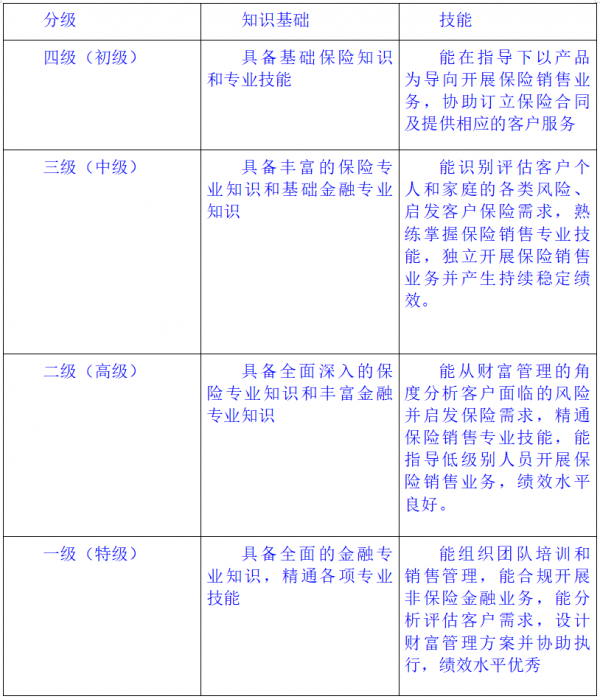 根据讨论稿,人身险方向个人保险代理人能力等级划分为四级,从低到高依次分别为四级(初级)、三级(中级)、二级(高级)、一级(特级)。初级具备基础保险知识和专业技能,中级在具备丰富的保险知识外还具有金融专业知识,能独立开展保险销售并稳定产出;而高级则具备丰富的金融知识,能从财富管理角度分析客户面临的风险启发保险需求;特级则能组织团队培训和销售管理,能合规开展非保险金融业务。
