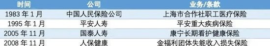 经上海市政府批准,中国人民保险公司1982年开始试点开办《上海市合作社职工医疗保险》,凡属独立核算、自负盈亏的合作社性质的集体企业单位,均可申请参加。经试点后于1983年1月正式实施,这是恢复保险业务后第一个商业健康保险业务。
