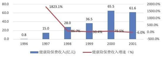 1996年,我国商业健康保险保费仅7800万元,1997年增长至15亿元,1998年-2001年,保费收入分别为28亿元、36.5亿元、65.5亿和61.6亿元。