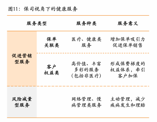 健康服务种类繁多,按照原银保监会的分类,保险公司健康管理服务分为健康体检、健康咨询、健康促进、疾病预防、慢病管理、就医服务、康复护理等七大类型。我们认为这是一种从客户角度看到的服务视图。如果按保司视角,我们认为健康服务总共可以被分为促进营销类服务和风险减量类服务(见图11)。其中前者意义在增加保单吸引力,或是形成有梯度的权益体系,牵引保单销售和客户加保,而后者则是为了主动管理、减少疾病发生和理赔。