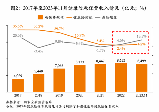 截至2023年,我国商业健康险市场保费规模为9035亿元,较去年同期增长4.4%,已连续三年增速处于个位数区间;