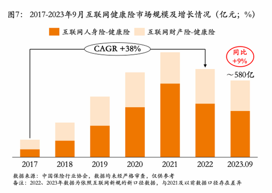 截至2023年前9月,互联网健康险保费规模约580亿元,同比增长9%,但与过往五年复合增速相比,互联网健康险增速已经大幅度趋缓;
