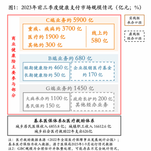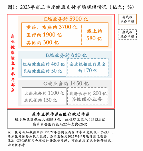 我国健康险市场以个人业务为主。据不完全统计,截至2023年前三季度,我国健康险市场在全量规模口径下近8000亿元,其中C端个人业务占据主要份额,其规模约为5900亿元,行业占比近75%;B端企业雇主业务接近700亿元,占比约为8%;G端政府业务涵盖大病、长护及城市定制型医疗保险业务等,规模超1400亿元,占比约为17%。在市场分布上我国商业健康险个人端占比明显高于政府、企业端,但从国际经验看,健康险企业往往会因扩大风险池、避免逆选择上更加倾向于政府、企业市场,这一点上我国和海外发达市场形成了显著差异。在经营类别上,截至2023年前三季度,我国商业健康险保费(承办)口径规模同比增长5%,占整体市场的95%;非保费(经办)口径的规模同比持平,占市场的5%左右。