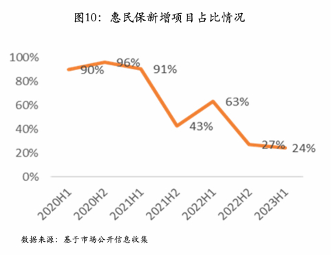 惠民保进入存量项目深耕关键期。经历2020-2022年第一轮爆发式增长后,惠民保市场23年进入存量博弈阶段,主要表现为城市型项目空白市场收窄,剩余市场可开拓性不强。直辖市、单列市、部分东南沿海地区均已实现100%全覆盖。中部重点地区平均覆盖率也已超半数。整体以存量续期项目为主,新增项目数占比整体呈下降趋势,目前仅1/4为新增项目(见图10)。除了覆盖率以外,惠民保省级项目还面临增速减缓,推广效果不及预期情况。2023年省级项目增速减缓,截至三季度末,仅新增2个省级项目。省级项目参保率不足,平均参保率仅5%。