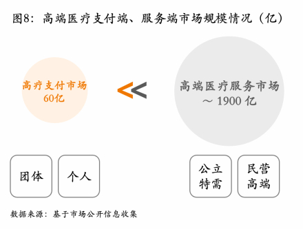 我国高疗险市场具有五大特征。根据行业数据统计,我国高端医疗险保费规模为60亿,远远小于1900亿的高端医疗服务市场,高疗支付市场还具有发展潜力(见图8)。我们从趋势上看,高疗险市场存在五大特征:(1)高疗险是一个平稳增长的市场。高端医疗险近五年年复合增速约为20%,慢于其他医疗险增速。(2)高疗险是一个发达区域市场。区域贡献上,北京、上海保费贡献占比较大,约为85%;广州、深圳则贡献10%。(3)高疗险是一个团险市场。团险占比约为70%,个人高端医疗约占30%。(4)高疗险是一个寡头市场。前四名头部玩家市场份额占比约80%,行业集中度高,其中TPA参与度较高。(5)高疗险是一个微利市场。高疗险利润率明显低于百万医疗险,一些企业高疗险利润率在个位数,部分企业出现亏损也是常态,如前段时间BUPA退出中国高疗险市场的本质便是来自其较大的经营压力。