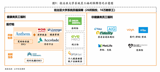 中国当前企业端市场尚处于早期发展阶段,需求端对企业员福的认识尚不成熟,与海外市场相比存在较大偏差。根据2022年美国劳工部数据,美国劳动者平均时薪约为$39,其中员福为薪资的45%,而《2021年中国员工激励与员工福利概览》提示,中国企业补充福利约为薪资的7%左右。站在国内需求端的各方角度来看:(1)央、国企通过企业员福来提高员工效率的意识仍有待提升;(2)民企通过企业员福来留存人才的观念不强;(3)员工更希望有更多的现金奖励而非员福保障。而纵观美国企业发展,美国员工福利覆盖更为广泛、待遇更为优厚。美国企业为员工提供的员福方案不仅局限于医疗险、寿险,同时也提供了齿科险、视力险、健康管理和宠物险等多元化可选产品(见图9)。特别是认为通过健康管理等员福项目进行支付转移,将有利于提高员工留存、增加员工对企业的忠诚度。为满足雇主需求和增加客户粘性,美国健康险公司会将第三方服务作为权益捆绑至保险产品提供给雇主,例如安森为佐治亚大学整合健康管理第三方服务供应商提供服务。相较于雇主直采第三方服务,健康险公司整合第三方健康服务供应商具有一定优势。