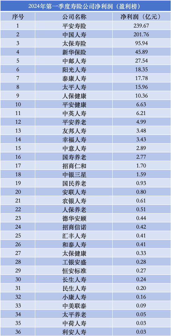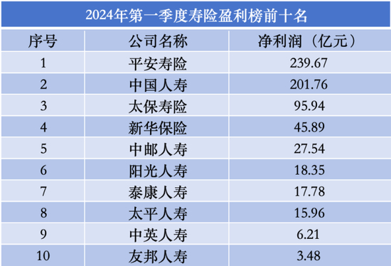 截至目前,已有76家人身险公司对外披露了2024年一季度盈利情况,从其盈利榜单来看,上市险企净利润大多稳居盈利榜单前五名,平安寿险位居盈利榜单第一,净利润为239.67 亿元;中国人寿位居第二,净利润为201.76 亿元。位列第三、第四名的太保寿险、新华保险净利润分别为95.94亿元、45.89亿元。