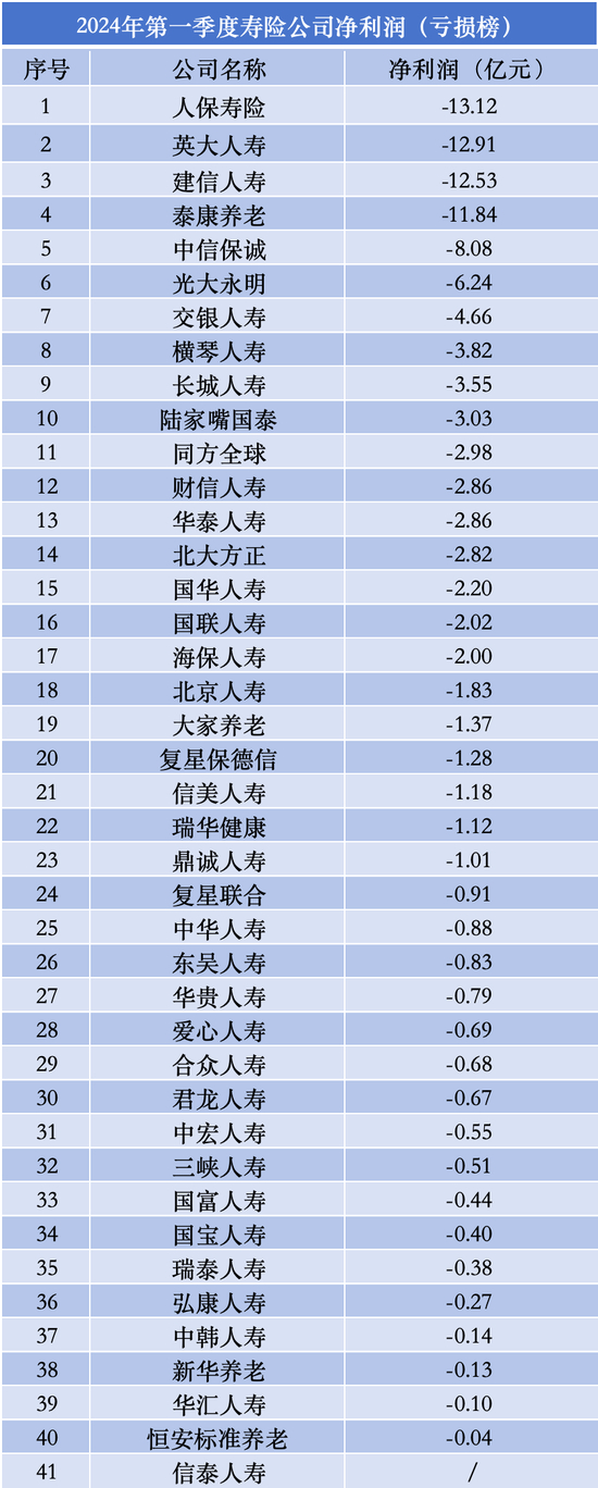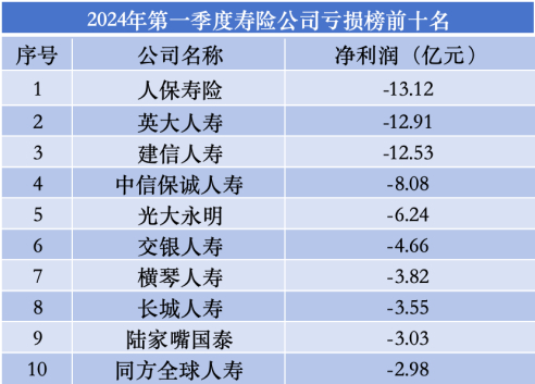 从76家寿险公司2024年一季度亏损榜单前十名来看,分别是人保寿险、英大人寿、建信人寿、中信保诚人寿、光大永明人寿、交银人寿、横琴人寿、长城人寿、陆家嘴国泰、同方全球人寿,亏损金额分别为-13.12亿元、-12.91亿元、-12.53亿元、-8.08亿元、-6.24亿元、-4.66亿元、-3.82亿元、-3.55亿元、-3.03亿元、-2.98亿元。