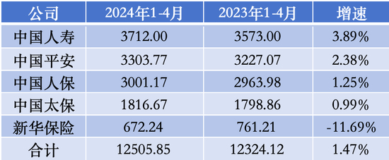 近期A股五大上市险企已公布2024年前四月保费收入。中国人寿、中国人保、中国平安、中国太保、新华保险前四月共揽保费收入达1.25万亿元,相较去年同期增长1.47%。其中,五家上市险企合计人身险保费收入约为8594.2亿元,同比微增0.4%。