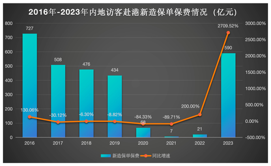数据是最有说服力的佐证,据此前香港保监局公布的2023年香港保险业的临时统计数据,香港毛保费总额较2022年下跌1.1%至5497亿港元,但内地访客的新造保单保费却高达589.72亿港元,较2022年同比飙升2754.4%,约占个人业务总额的32.6%,仅次于2016年的高峰。