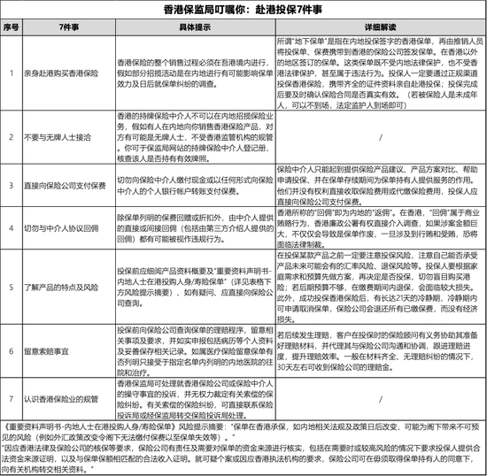 有鉴于内地客户赴港购买保险热情高涨,而这种投保又存在诸多潜在风险,今年4月,香港保监局叮嘱内地客户“赴港投保7件事”,包括:亲身赴港购买香港保险、不要与无牌人士接洽、直接向保险公司支付保费、切勿与中介人协议回佣、了解产品的特点及风险、留意索赔事宜、认识香港保险业的规管等。