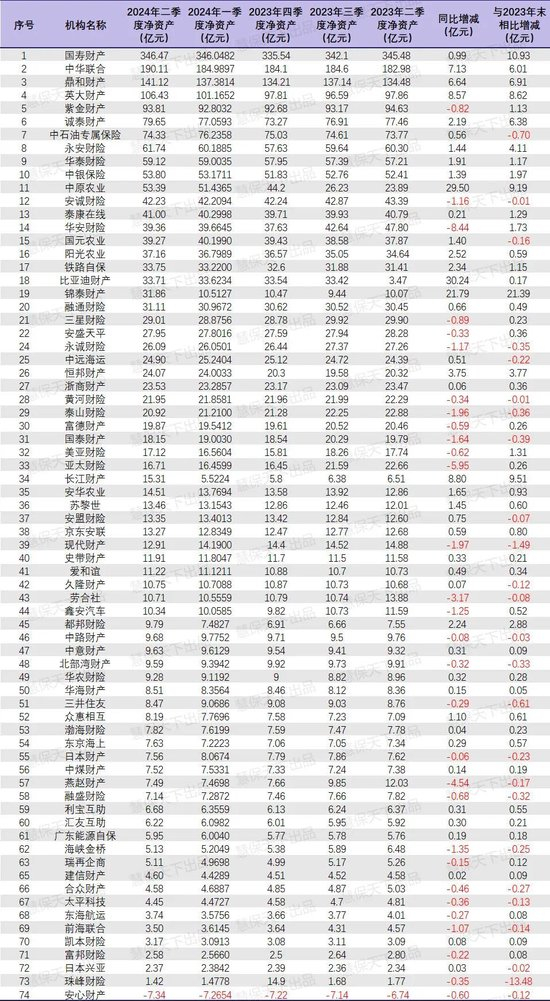 72家财产险公司中,仅安心财险一家目前净资产为负值,低至-7.34亿元,有30家险企净资产数据较2023年同期有所下滑。