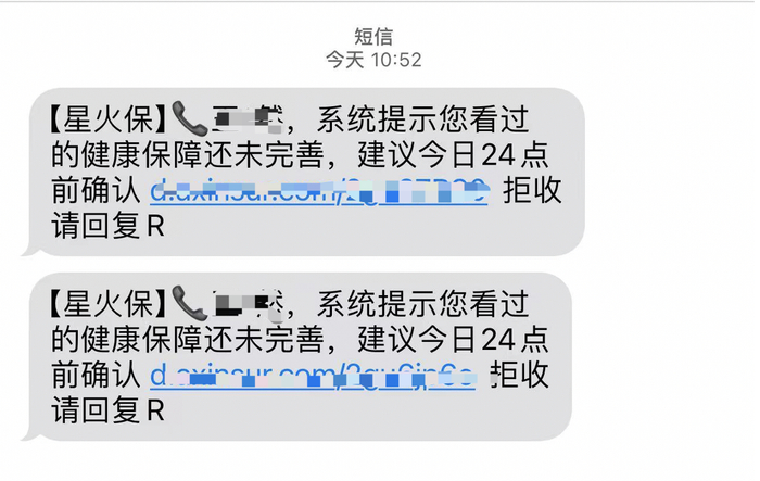 在记者放弃购买升级产品后,公司多次通过短信、电话等形式,称当前的保障额度不足,建议消费者升级产品。