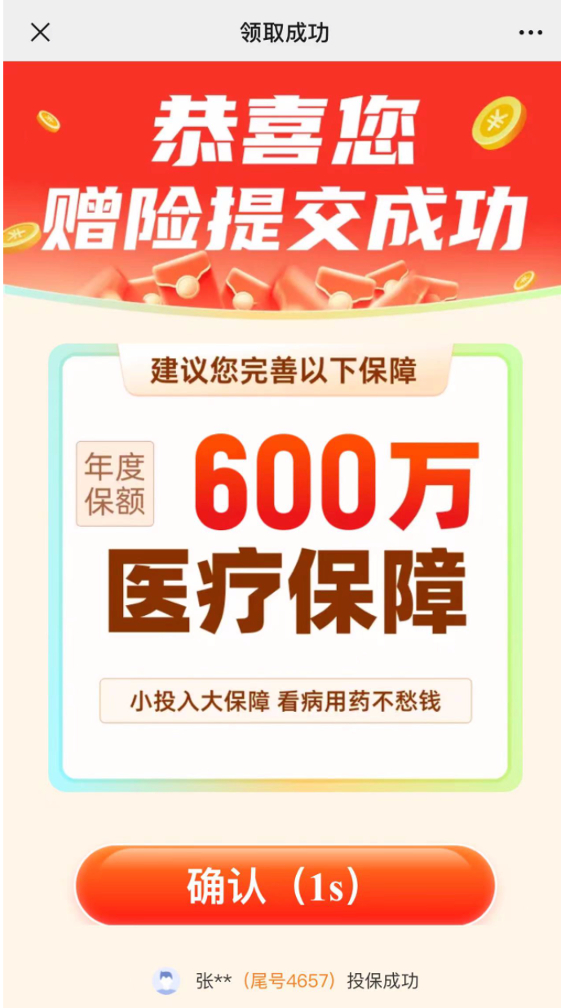 在点击“免费领取”后,该平台短暂出现了一秒左右领取成功的页面后,强制弹出另一款防癌险产品。而此时投保人还以为正在进行此前免费领取的步骤,匆忙中进行操作,购买了所谓的 “升级”保险产品。
