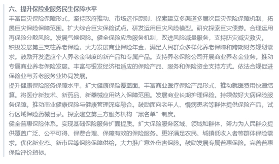 “巨灾”“养老”“健康”“普惠”是提升民生保障水平的关键领域。对巨灾保险而言要丰富保障形式,探索建立多渠道多层次巨灾保险保障机制,扩大综合巨灾保险试点,研究探索巨灾债券;其次是积极发展第三支柱养老保险,鼓励开发适应个人养老金制度的新产品,支持养老保险公司开展商业养老金业务;同时,将医疗新技术、新药品、新器械应用纳入保障范围,以提升健康保险服务水平;此外,还将探索建立第三方服务机构“黑名单”制度;最后是大力推广意外伤害保险;最后鼓励发展专属普惠保险。完善普惠保险评价指标。