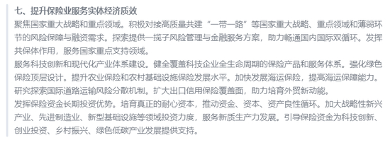 聚焦到保险业服务实体经济上,积极对接高质量共建“一带一路”等国家重大战略、重点领域和薄弱环节的风险保障与融资需求。探索提供一揽子风险管理与金融服务方案,助力畅通国内国际双循环。同时,加快发展海运保险。研究探索国际道路运输风险分散机制。此外,发挥保险资金长期投资优势。培育真正的耐心资本,推动资金、资本、资产良性循环。