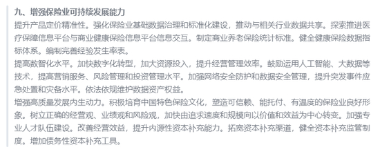 为增强保险业可持续发展能力,从产品定价、数智化、内生动力三个方面入手。探索推进医疗保障信息平台与商业健康保险信息平台信息交互;鼓励运用人工智能、大数据等技术,提高营销服务、风险管理和投资管理水平;拓宽资本补充渠道,健全资本补充监管制度。增加债务性资本补充工具。