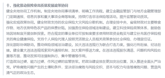 最后就是强调保险业高质量发展政策协同。建立相关部门定期通报、信息共享和重大事项会商等制度。鼓励各地因地制宜开展创新探索。同时深化部际协调联动,在违法违规股东清退、问题机构风险处置等方面,推动发挥司法强制执行、集中管辖等作用。