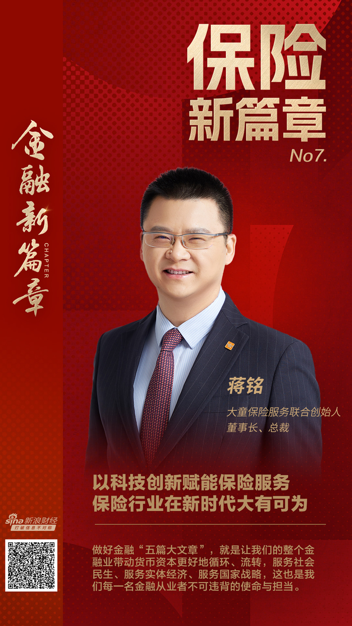 中央金融工作会议指出,要做好科技金融、绿色金融、普惠金融、养老金融、数字金融“五篇大文章”,为推进金融高质量发展指明了方向。有鉴于此,新浪财经年度策划《金融新篇章》特别推出《保险新篇章:高质量发展之路》系列访谈栏目,深度对话险企高管,探索行业高质量发展之路。