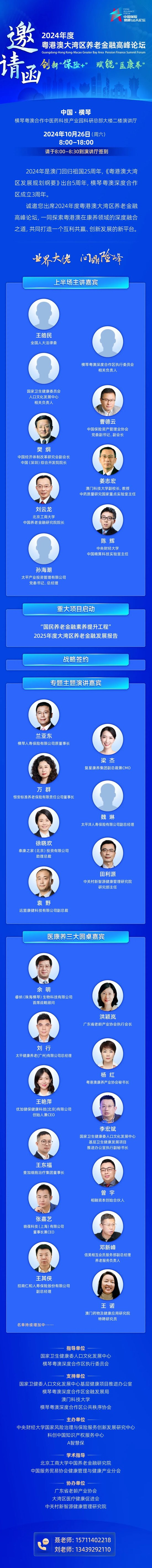 在横琴粤澳深度合作区执行委员会的指导下,在国家卫生健康委人口文化发展中心基层卫生健康发展项目推进办公室、横琴粤澳深度合作区金融发展局、澳门科技大学、横琴粤澳深度合作区公共秩序协会的鼎力支持下,A智慧保作为头部新媒体,将联合中央财经大学国家风险治理与保险服务创新发展研究中心、科创中国知识产权服务中心于10月26日举办“2024年度粤港澳大湾区养老金融高峰论坛”,从顶层设计、产业融合、模式创新等维度深度探讨,带来一场有前瞻、有实战、有研判的思想交流盛宴。