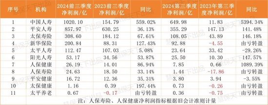 注:在2024年三季度偿付能力报告中,一些人身险公司其实是同时采用了旧会计准则以及新会计准则,如在保险业务收入、投资收益率、综合投资收益率等指标上部分公司按照旧会计准则计量,而在净利润、总资产、净资产等指标上则按照新会计准则计量。此外,部分公司2023年前三季度数据口径为旧会计准则,而今年则为新会计准则。由于新旧准则差异,不同险企之间难以简单横向对比,部分净利润数据也不具备可比性。