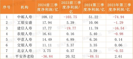 具体而言,前三季度48家险企实现盈利,净利润合计3003.82亿元。净利润超十亿元的险企有17家之多,除了中国人寿、平安人寿、太保寿险等上市寿险公司外,中邮人寿、泰康人寿、工银安盛、建信人寿等非上市人身险公司亦榜上有名。