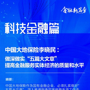中央金融工作会议提出金融“五篇大文章”,为金融高质量发展指明方向。正如李晓民所说:“中国大地保险作为国有金融企业,必须深刻把握中国式现代化这个最大的政治,认真践行金融工作的政治性、人民性,服务中国式现代化,做好‘五篇大文章’,实现高质量发展。”