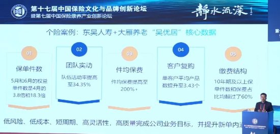 个险案例:在东吴人寿+大雁养老的个险合作中,销售队伍活动率最高提至34.35%,件均保费提高到2倍以上,客户复购方面,单客户平均产品数提升至3.43个,5月和6月的权益单件数是4月的3.8倍和18.3倍,10年期及以上保单件数和保费占比均超过了60%。大雁模式可以低风险、低成本、短周期、高灵活性助力保险公司完成业务目标。