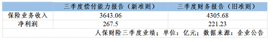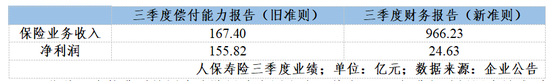 值得注意的是,三季度偿付能力报告中,交银人寿仅以新准则编制净利润和保险合同负债,其余数据仍使用“旧准则”,因此,其保险业务收入保持一致。