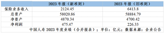 此外,比较典型的还有寿险巨头中国人寿,其在2023年进行了新旧会计准则切换,在财报中披露的两种模式计量的净利润分别为226亿元、475亿元,相差1倍有余,而新准则下保险业务收入则仅为旧准则下的1/3。