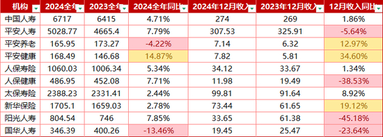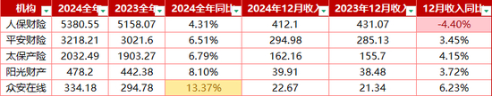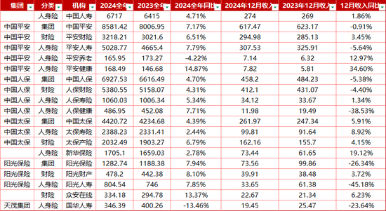 2024年全年,10家机构总揽1.89万亿原保险保费收入,同比增长4.87%。单12月总揽原保险保费收入868.94亿元,同比减少0.35%。对比之下,单月保费增速乏力。且有四家机构单月呈负增长态势。