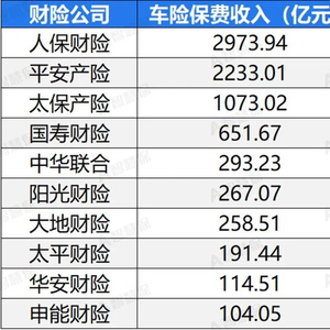 而后依次是国寿财险、中华联合、阳光财险、大地财险、太平财险、华安财险和申能财险,2024年车险保费收入分别为651.67亿元、293.23亿元、267.07亿元、258.51亿元、191.44亿元、114.51亿元和104.05亿元。