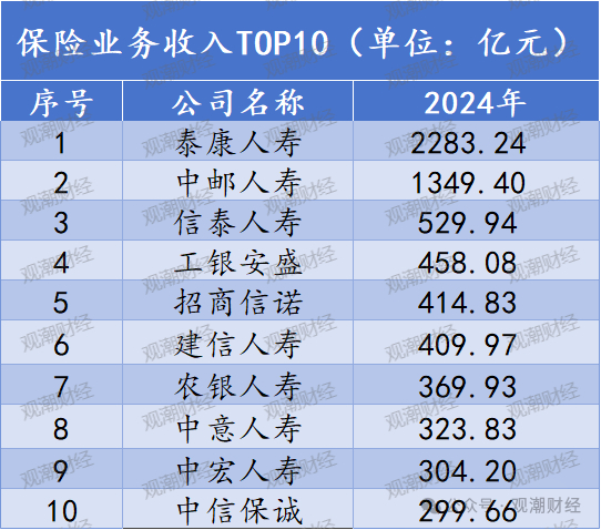 保费收入排名前10的险企中,泰康人寿、中邮人寿2024年保险业务收入均超1000亿元,分别达2283.24亿元、1349.40亿元。