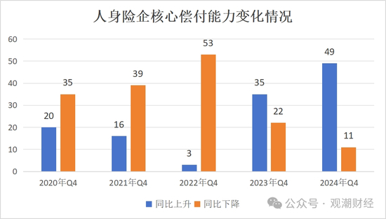 核心偿付能力方面,人身险企2024年变化则更加明显。2024年4季度,有49家人身险企核心偿付能力出现不同程度上升,较2023年同期增加14家。其余11家险企核心偿付能力则有所下滑,不过数量占比不足两成,为近6年最低。