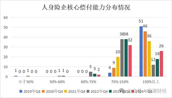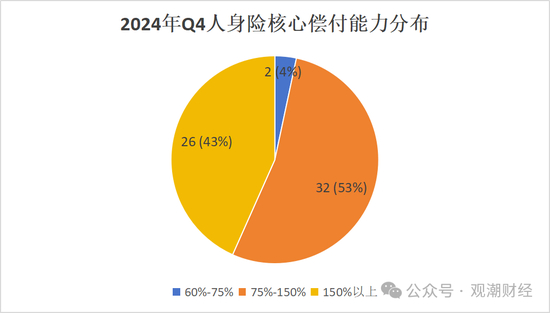 核心偿付能力数据显示,2024年4季度人身险业超半数险企的核心偿付能力在75%—150%区间内,合计32家,占比53%;险企占比第二大区间为150%以上,共26家险企,占比43%。
