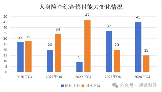 2024年也是人身险行业近5年综合偿付能力正增长公司数量最多的一年。60家人身险企中有45家综合偿付能力实现正增长,较2023年同期增加8家,偿付能力下滑险企数量则减少了5家。