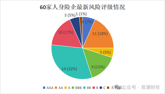 具体来看,60家披露最近风险评级的人身险企中,18家评级达到A类。其中,AA级人身险企为A类险企中数量占比最多的评级,共11家,占比18%;其次为AAA级,共4家险企,占比7%,分别为恒安标准人寿、中荷人寿、工银安盛、国民养老。此外,A级险企共计3家,占比5%。