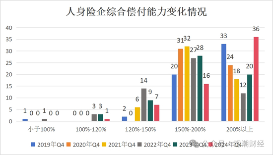 上图所示,自2019年起,4季度综合偿付能力在200%以上区间的人身险企数量已连续四年下滑,由2019年4季度的33家降至2022年4季度的12家,4年合计减少11家公司。随后在2023年开始增加,截至2024年4季度,此区间人身险企数量已达近6年最大值,至36家,占比60%。