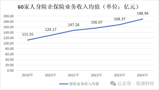 从保险业务收入均值来看,2019年至今整体呈逐年上升趋势。至2024年底,60家人身险企保险业务收入均值已达188.94亿元。