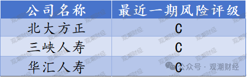 在大多数人身险企风险评级均达标的情况下,仍有3家人身险企风险评级不达标,分别为北大方正、三峡人寿、华汇人寿,风险评级均为C。