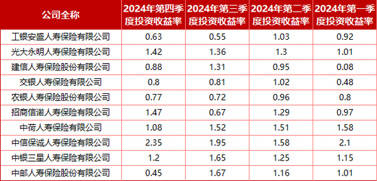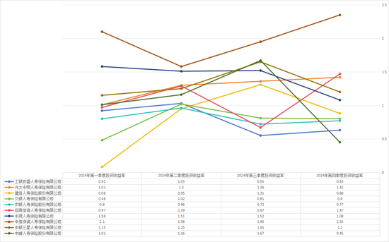分季度看,投资收益率“分歧”较大,就第一季度而言,最小值为建信人寿0.08%,最大值为中信保诚人寿2.1%,相差很多;到了第二季度,大部分机构的收益率普遍企稳并回升,集中在1.2%附近;然而到了第三季度,或受权益市场调正等影响,险企的收益率开始震荡,4家机构环比下降;到了第四季度,震荡似乎并未减弱,第四季度投资收益率最低为中邮人寿0.45%,而中信保诚人寿则以2.35%的投资收益率位居最高。