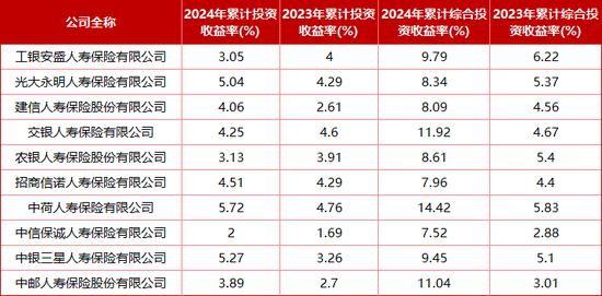 聚焦到资产端上,2024年累计综合投资收益率全部上涨,但是2024年累计投资收益率中,工银安盛人寿、交银人寿、农银人寿较2023年成绩有所下降。