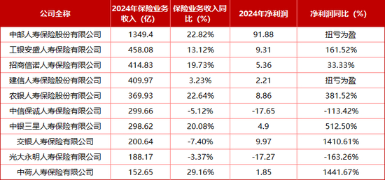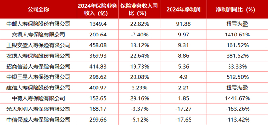 需要注意的是,2024年部分险企净利润是在新准则下公布的,如中邮人寿、农银人寿、工银安盛、建信人寿、交银人寿等,故会出现净利润同比大幅增长的情况。