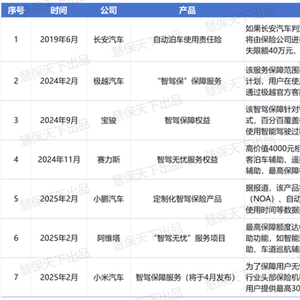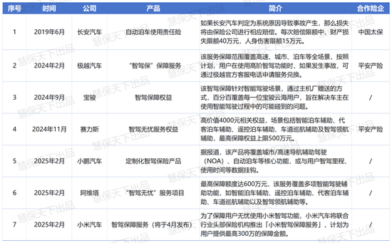 年初起,一众头部车企投身智驾军备赛,喊出“智驾元年”“智驾平权”等口号,在智驾技术飞速发展的另一边,小米、“华为系”赛力斯等众多车企纷纷在“智驾险”“智驾保”“智驾无忧服务”……上落子布局。据“慧保天下”不完全统计,截至目前,已有7家车企先后推出了诸如“智驾险”等的产品和服务,而这些服务往往声称价值在数千元,而最高赔付额度更是高达数百万元,为开展此类服务,有的车企直接与保险公司开展合作,但大多数并未公布合作保险公司信息,保障形式有可能更接近于延保服务。