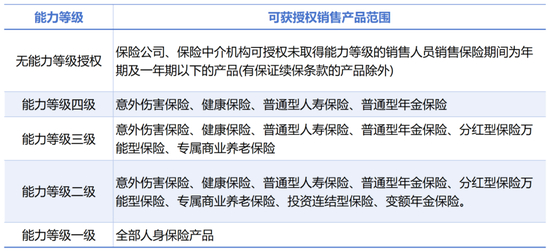 《自律规则》对于销售人员如何具体分级并没有明确规定,但值得注意的是,2024年初,保险业协会曾发布《保险销售从业人员销售能力资质等级标准(人身险方向)(征求意见稿)》和《人身保险产品销售授权管理自律规则(征求意见稿)》,提出将销售人员划分为一级至四级以及无能力等级授权五个等级,且能力等级不同,可销售产品范围不同。(详见下表,相关报道请点击《定调!200万保险销售人员这样分级分类:考取执业证方能销售长期产品,分红险万能险须获三级认证》)
