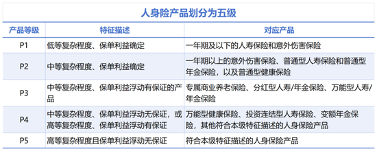 人身保险产品按照复杂程度和保单利益确定性划分为P1至P5五个等级。复杂程度主要依据产品责任范围、保障期限及设计结构综合评定;而保单利益则分为“确定型”与“浮动型”,其中浮动型又细分为“有保证利益”和“无保证利益”。