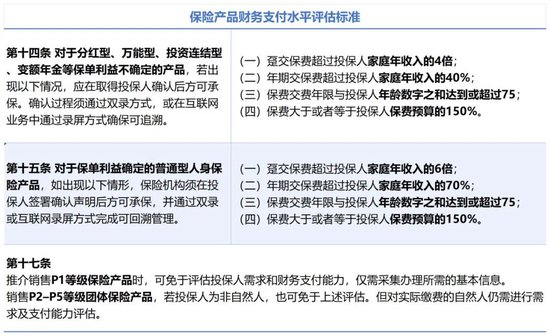 根据《自律规则》,客户投保分红险、万能险、投连险等保单利益不确定的人身险产品时,若趸交保费超过家庭年收入4倍,或期交保费超过40%,需客户确认方可承保;销售普通型人身险产品时,则相应门槛为6倍和70%。而销售风险更高的产品时,还须对产品和客户风险承受能力进一步细分等级。