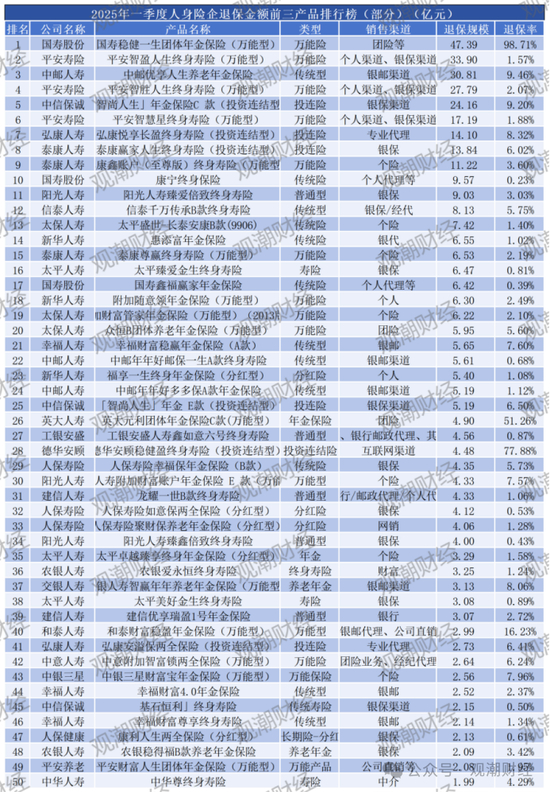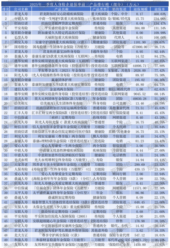 附2:2025Q1退保金额前三产品排行榜(部分)