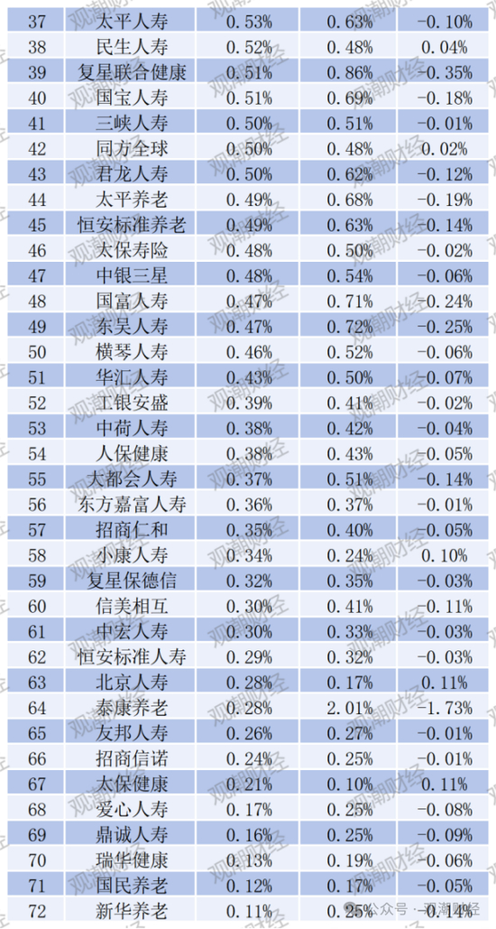 其中有46家险企降幅未超1个百分点,4家险企的降幅位于1%到2%之间。另有海保人寿、大家养老2家险企的降幅超过2个百分点,分别下降2.6个百分点、4.77个百分点。