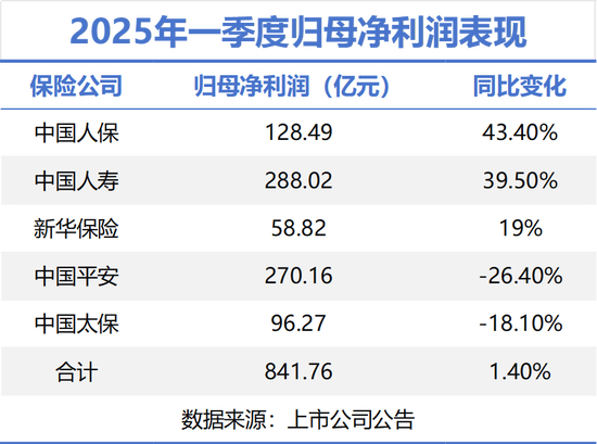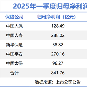 2025年第一季度,A股五大上市险企延续稳健增长态势。中国人寿、中国人保、中国平安、中国太保、新华保险合计实现归母净利润841.76亿元,同比微增1.4%。